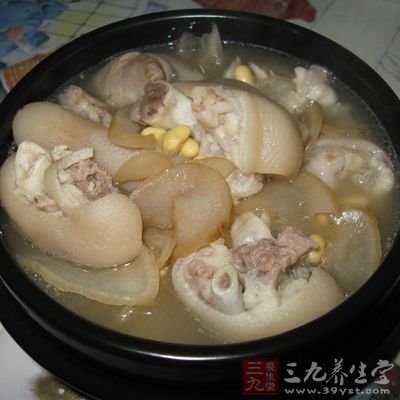 黃豆豬蹄湯是一道漢族藥膳。做法簡單,營養豐富,適合秋冬季滋補,具有通乳、氣血雙補、補虛養身等功效。豬蹄用沸水燙後拔淨毛,刮起去浮皮;把黃豆提前浸泡1小時,備用;姜洗淨切片;大蔥切段;豬蹄內加入清水、姜片煮沸,撇沫;加上酒、蔥及黃豆,加蓋,用文火焖煮;至半酥,加精鹽,再煮1小時;調入味精,即可。