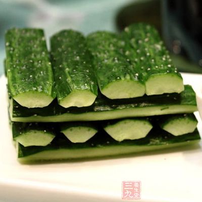 制作方法:將黃瓜洗淨,切成大約八厘米長手指頭粗細的小段,放在干淨容器內用鹽攪拌均勻,待用。