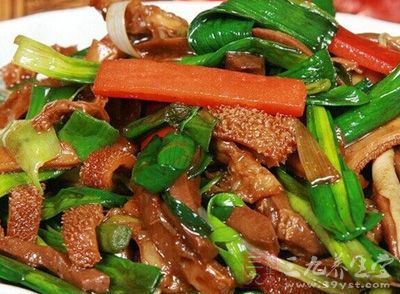 2、羊肚片下入沸水鍋內焯透撈出。鍋內放豬油燒熱,下入姜。蒜片、紅干椒炝香,下入玉蘭片、香菇略炒,加料酒、醬油、湯燒開。