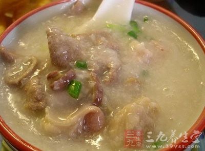 3、將豬腰放入粥內同煮,加入姜絲和鹽、胡椒粉後熄火盛出,撒上蔥花即可食用。