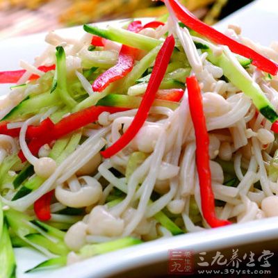 金針菇也可以搭配干豆腐絲、莴苣絲、白菜絲、胡蘿卜絲、火腿絲、海蜇絲等