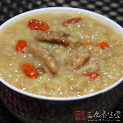 材料:30克胡桃肉、30克枸杞子、糯米150克、15克黃精、15克姜、60克白糖。