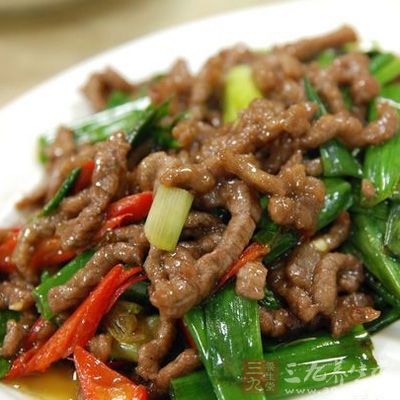3、放入牛肉炒到九成熟,加入剩余的蔥段、生抽、鹽、雞粉、白胡椒、香油翻炒,出鍋。