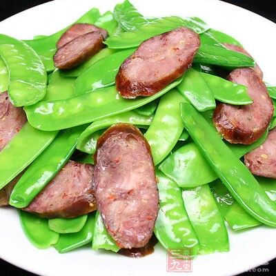 1.荷蘭豆洗淨、臘腸切成薄片、蒜切片