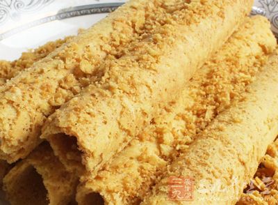 4.鍋裡放入豬油燒至六成熱,投入蛋皮肉卷炸至金黃色撈出,切成段塊即可食用。