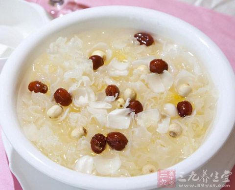 蓮子,百合,糯米,白糖;制法:蓮子、百合少許,洗淨後在水中泡20分鐘;糯米洗淨在鍋中煮開,置小火約10分鐘後,下泡好的蓮子和百合;將蓮子、百合、糯米煮至稠,放入適量的白糖即可食用。