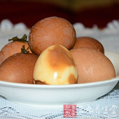 2.鍋放爐火上,倒入水一斤,加入醬油、白糖、精鹽、茶葉、桂皮、八角和雞蛋燒開,五分鐘後連鹵湯一起倒入盆內浸泡。食時剝去蛋殼,切塊裝盤,澆點鹵湯即成。
