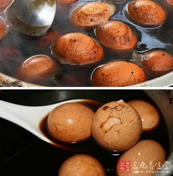 ②鍋置火上,放入剝去外殼的雞蛋,加入醬油、料酒、白糖、精鹽和紅茶、八角、桂皮、姜和蔥做成的香料包以及適量的清水,燒沸後,繼續用中火稍10分鐘左右即離火,將鹵汁和雞蛋一起倒入盆中,晾涼後,雞蛋切成六瓣,在盤中擺成菊花形,澆上鹵汁即成。 食譜營養:雞蛋被認為是營養豐富的食品,含有蛋白質、脂肪、卵黃素、卵磷脂、維生素和鐵、鈣、鉀等人體所需要的礦物質。