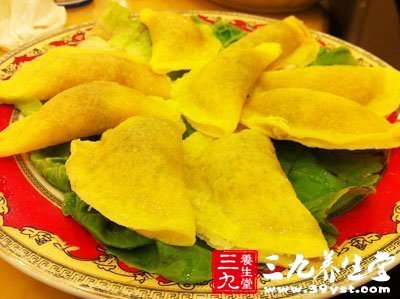3、把雞蛋對折成半月形,翻面煎一下即可取出待用。水開後,加入青葉蔬菜和蛋餃,稍加煮沸即可食用。