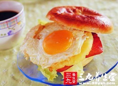 2.以平底鍋煎好蛋、火腿,放在焙果的切口上,加上鳳梨片後蓋上另外一半的焙果即成。