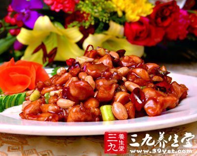 1、取嫩雞胸肉,用刀把肉拍松,切成3毫米見方的十字花紋,再切成2厘米見方的小塊,加鹽、、濕澱粉拌勻。這個雞肉丁是大廚先准備好的,就用不到我再次操作了。花生米同樣是事先炸好的,比我炸的好多了,感覺很脆。