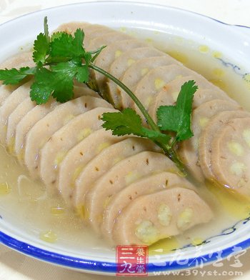 早在《神農本草經》中就有記載:藕“補中養神,益氣力,除百病,久服輕身耐老。”中醫認為,藕性寒味甘,入心、肝、脾、胃四經,分生、熟,且生、熟藥性有別。生藕性寒,甘涼入胃,可生津解渴,散瘀清熱,涼血,止嘔,所以婦女產後忌食生冷,惟獨不忌藕;熟藕更偏重於益胃健脾、養血補虛的作用。因此,吃熟藕對老年人特別是脾胃虛弱的人大有好處。藕段間的藕節因含有2%左右的鞣質和天門冬酰胺,其止血收斂作用強於鮮藕,還能解蟹毒。蓮藕肉質甘甜脆嫩,常用吃法是炖肉,素炒或葷炒,下面介紹幾種既飽口福又滋補養生的藕品佳肴: