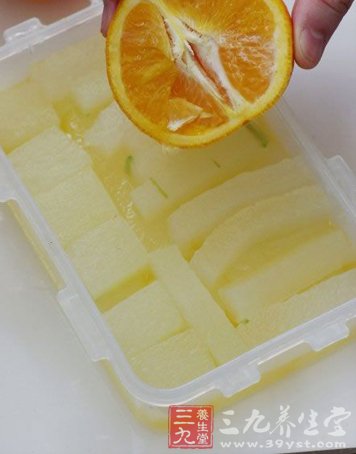 4.涼透的冬瓜放入保鮮盒,切開橙子,擠入橙汁;