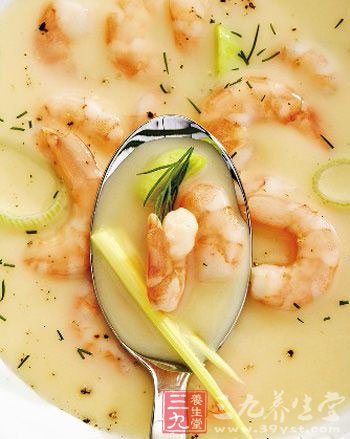 (3) 鍋置火上,倒入適量清水,旺火燒開後下入對蝦、通草和絲瓜絡,煎煮片刻後下入蔥段、姜絲和精鹽,改用中火煎煮至對蝦將熟,放入少許香油,再次燒開後即可食用。