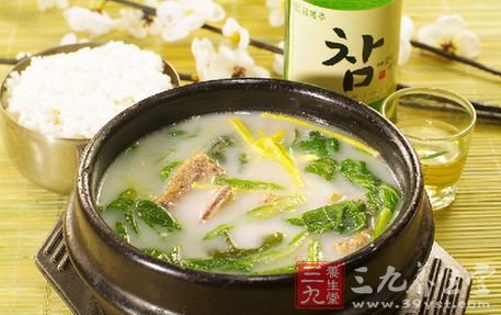 雞湯,特別是母雞湯中的特殊養分,可加快咽喉部及支氣管膜的血液循環,增強黏液分泌,及時清除呼吸道病毒,緩解咳嗽、咽干、喉痛等症狀。煲制雞湯時,裡面可以放一些海帶、香菇等。