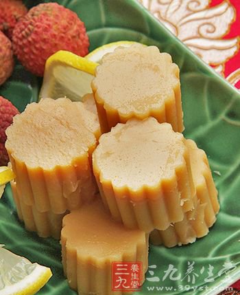 說明:這是明代宮廷食療驗方,出自《魯府禁方》。茯苓作用見前“茯苓糕”。《神農本草經》將山藥列為上品,說它“益氣力,長肌肉。久服,耳目聰明,輕身,不饑延年。“清代名醫張錫純說山藥是滋補藥中無尚之品。現代醫學研究闡明山藥含有澱粉酶、氨基酸、膽鹼、皂苷等,有增加白細胞吞噬功能,降低血糖等作用,所含澱粉酶能分解蛋白質和糖,所以有滋補生肌的效果。