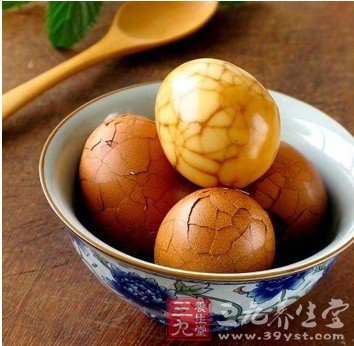 ②鍋置火上,放入剝去外殼的雞蛋,加入醬油、料酒、白糖、精鹽和紅茶、八角、桂皮、姜和蔥做成的香料包以及適量的清水,燒沸後,繼續用中火稍10分鐘左右即離火,將鹵汁和雞蛋一起倒入盆中,晾涼後,雞蛋切成六瓣,在盤中擺成菊花形,澆上鹵汁即成。