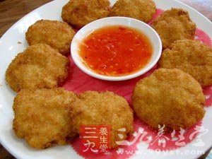制作方法:將腌制好的蝦膠捏成小餅狀,粘上杏仁粒,放入油鍋內炸至金黃。裝盤時,可用生菜葉鋪底襯色。