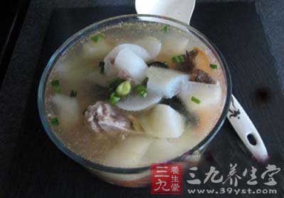2、白蘿卜去皮切塊,一同煮湯。